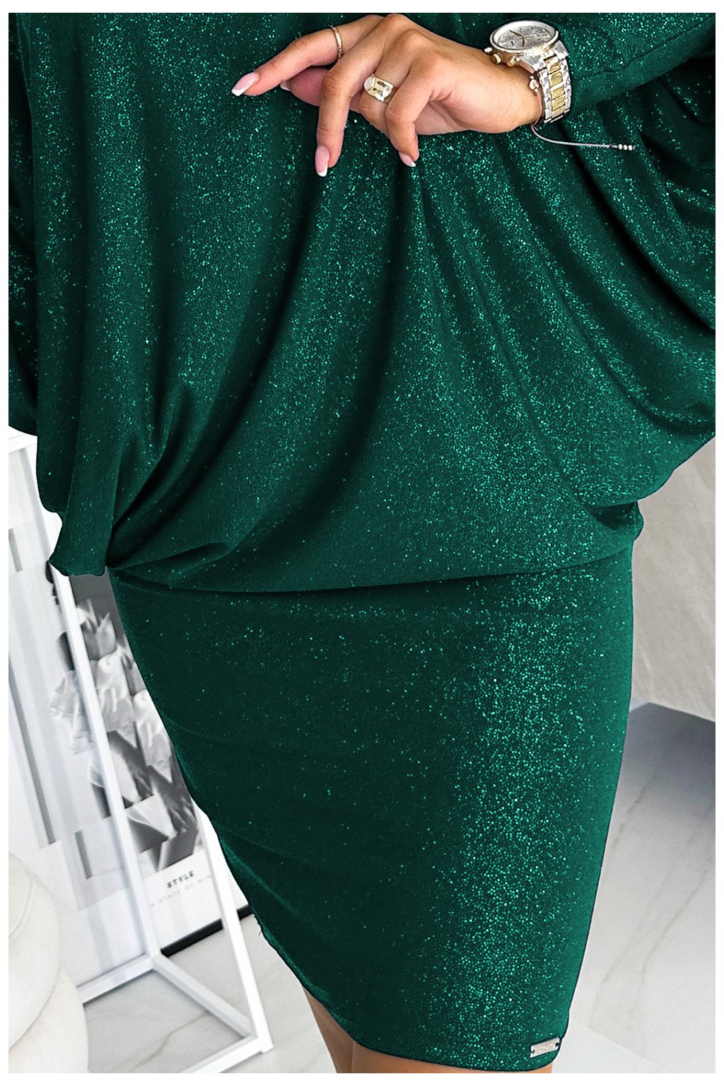 Netopýří šaty s výstřihem. Vyrobeno z elastického materiálu se třpytkami. Zelená barva. Značka Numoco. Polská výroba.