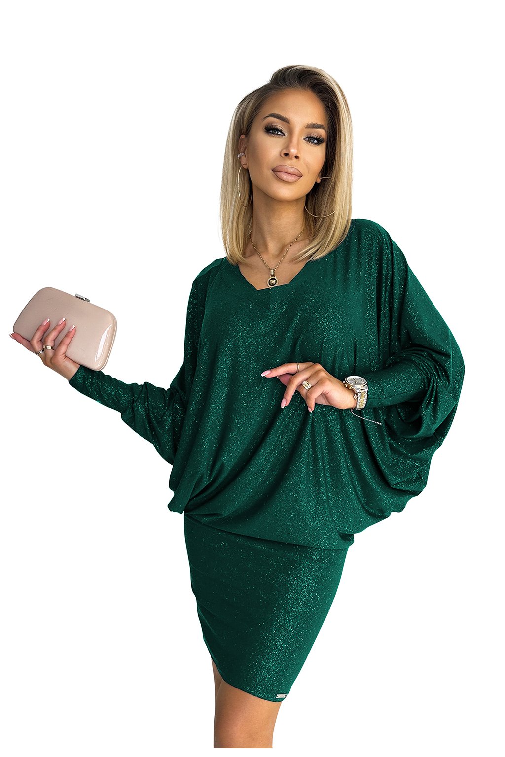 402-2 Netopýří šaty s výstřihem - zelená se třpytkami