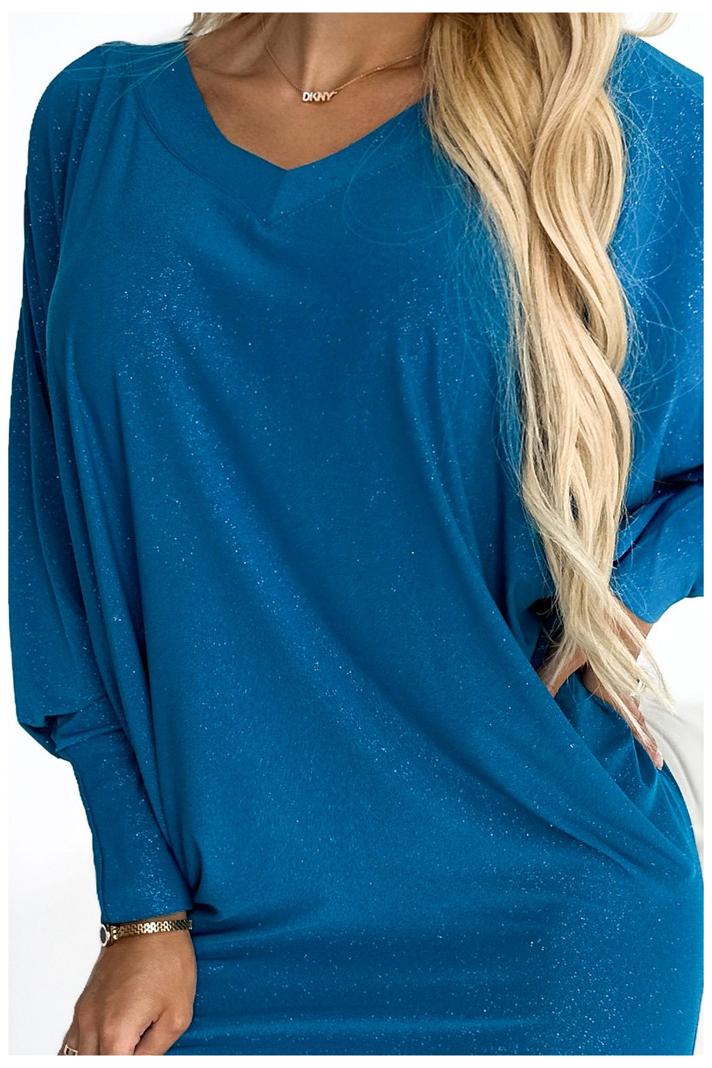 402-3 Netopýří šaty s výstřihem - mořská barva se třpytkami