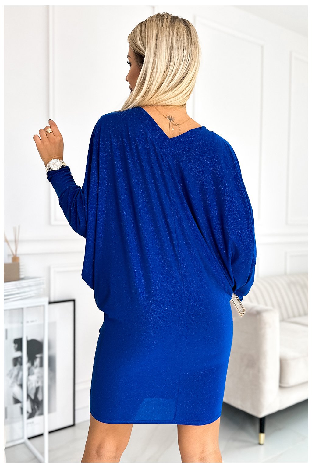 Netopýří šaty s výstřihem. Vyrobeno z elastického materiálu se třpytkami. Dá se nosit rovně nebo zastrčený. Modrá barva. Značka Numoco. Polská výroba.