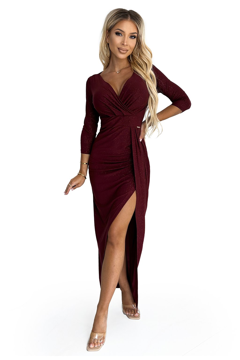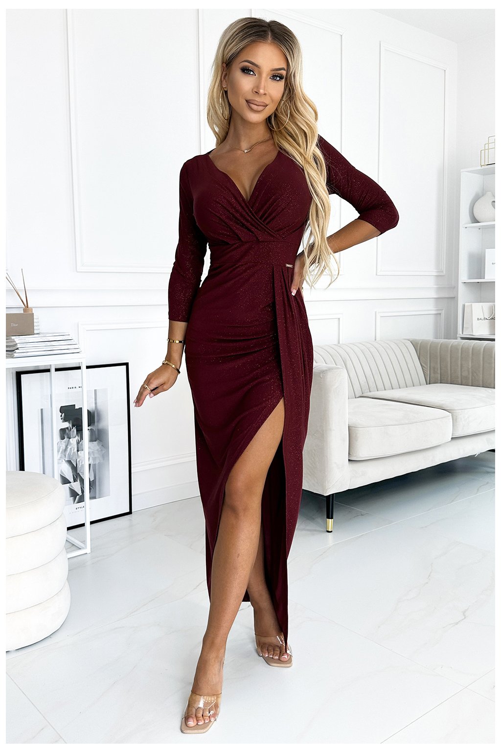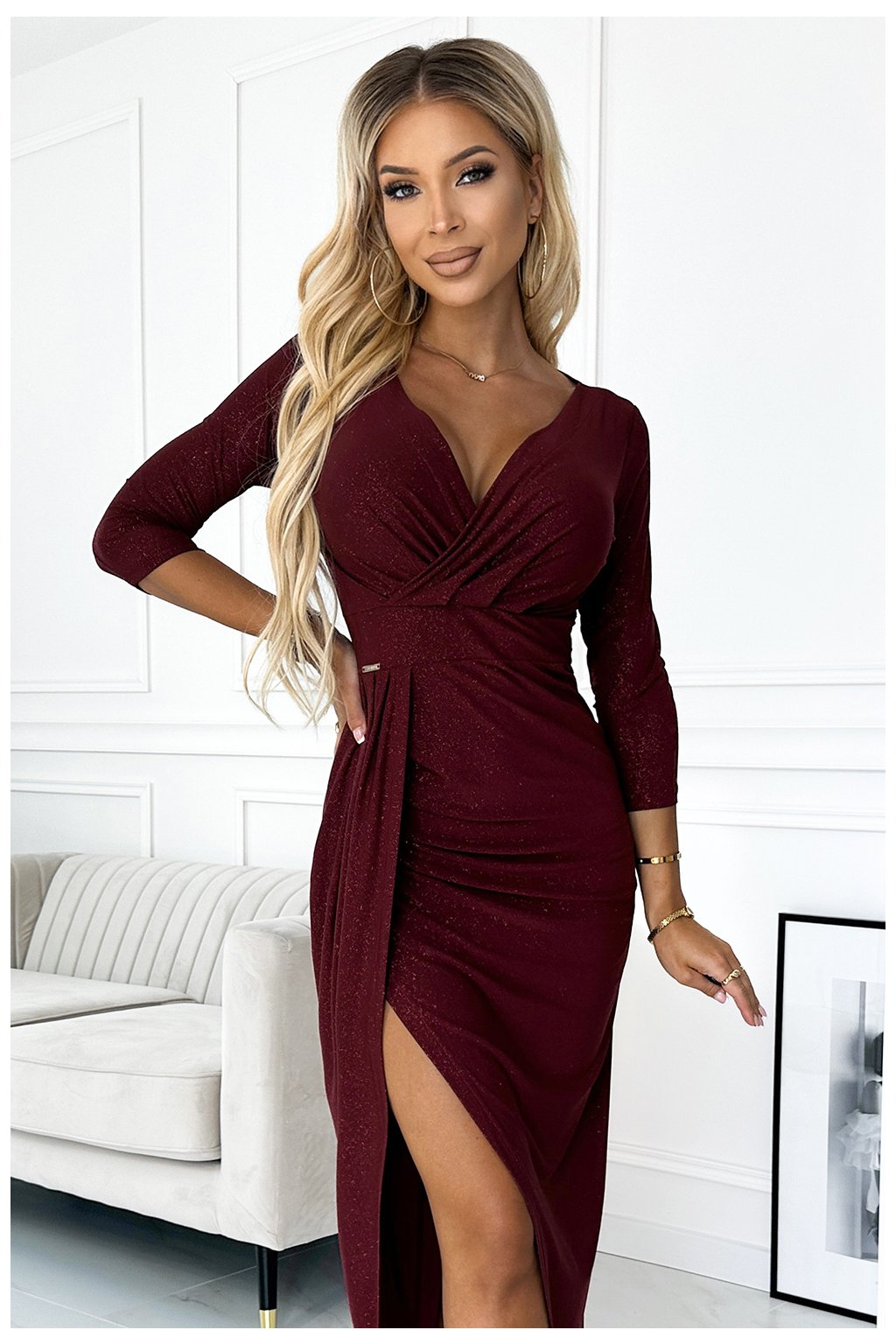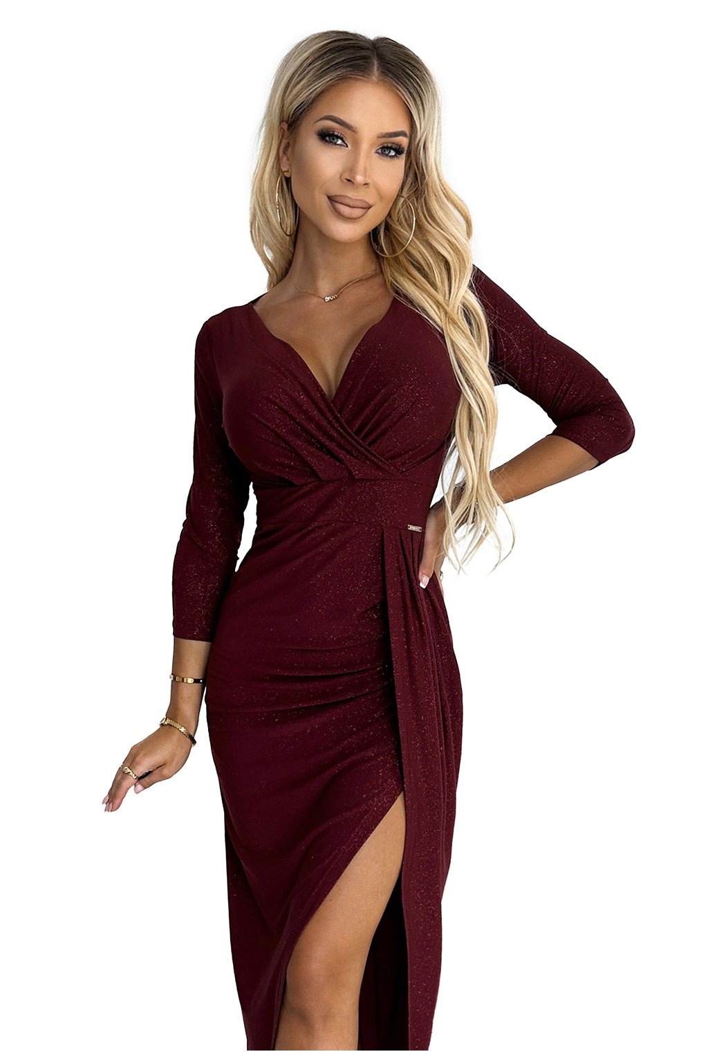 Lesklé šaty s psaníčkovým výstřihem a rozparkem na nohavici. Vyrobeno z elastického materiálu se třpytkami. Vínová barva. Značka Numoco. Polská výroba.