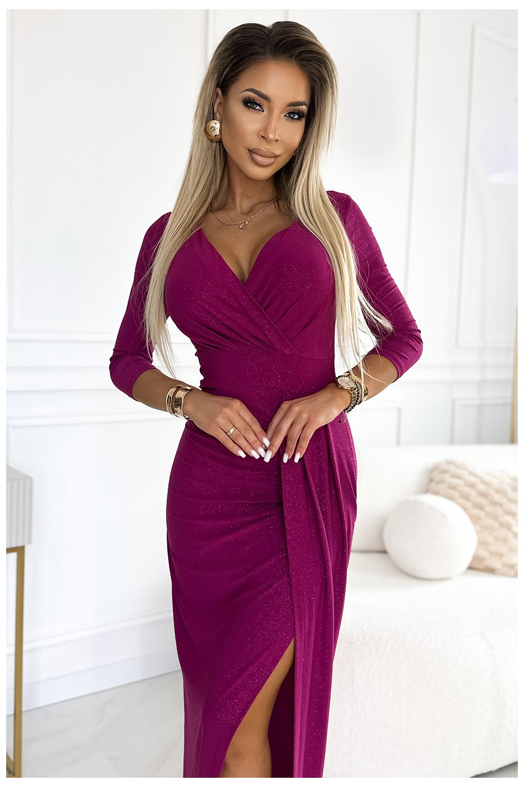 Lesklé maxi - dlouhé šaty s psaníčkovým výstřihem a rozparkem na nohavici. Vyrobeno z elastického materiálu se třpytkami. Barva: fuchsie. Značka numoco. Polská výroba.