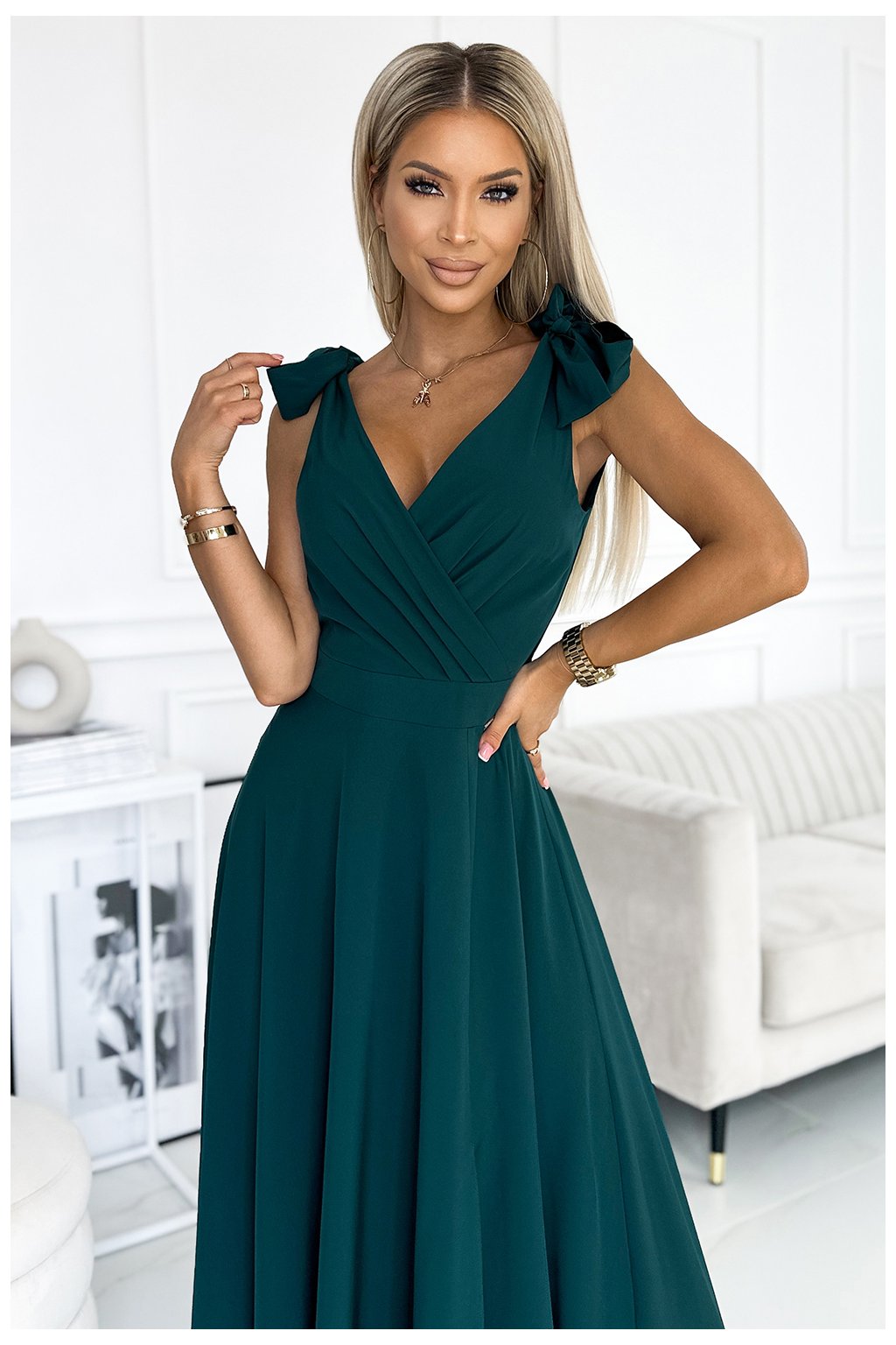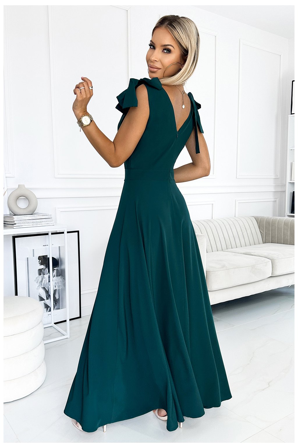 405-4 ELENA Dlouhé šaty s výstřihem a zavazováním na ramenou - zelené
