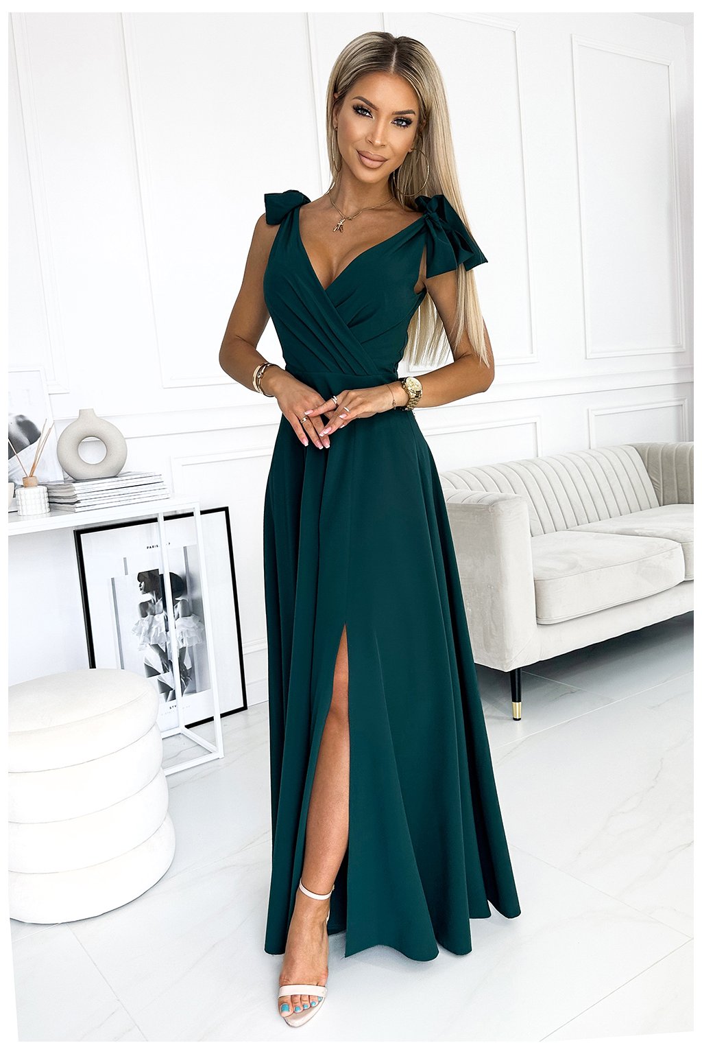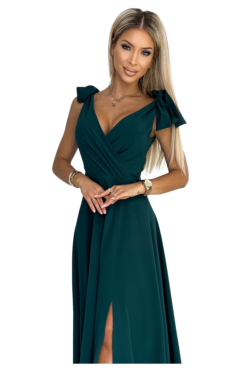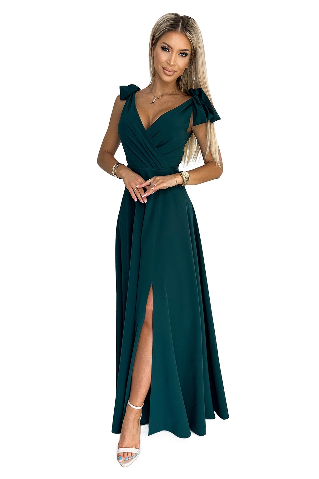 ELENA - dlouhé šaty s výstřihem, rozparkem na nohavici a mašlemi na ramenou. Vyrobeno z na dotek příjemného materiálu v zelené barvě. Polský výrobek. Značka Numoco.