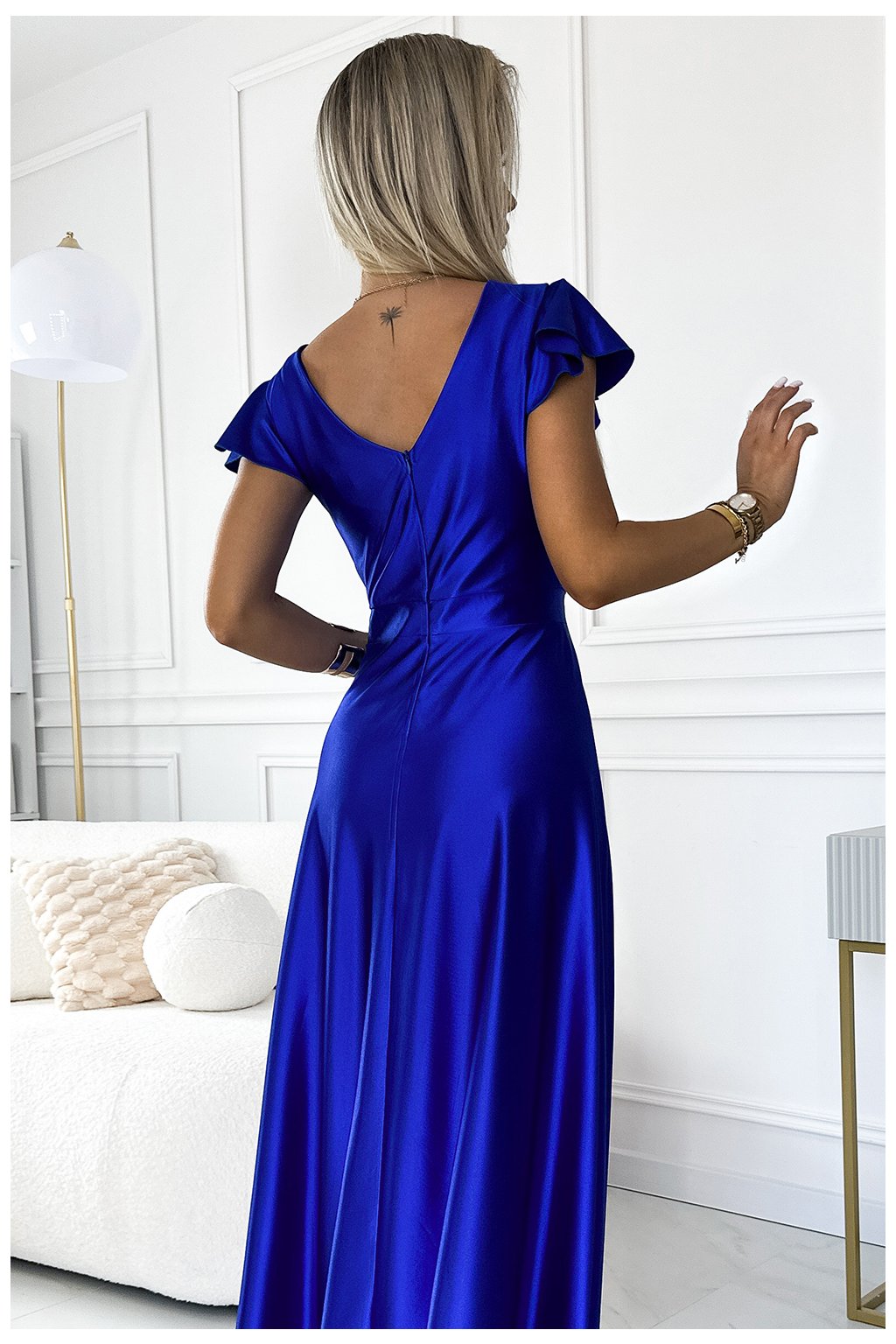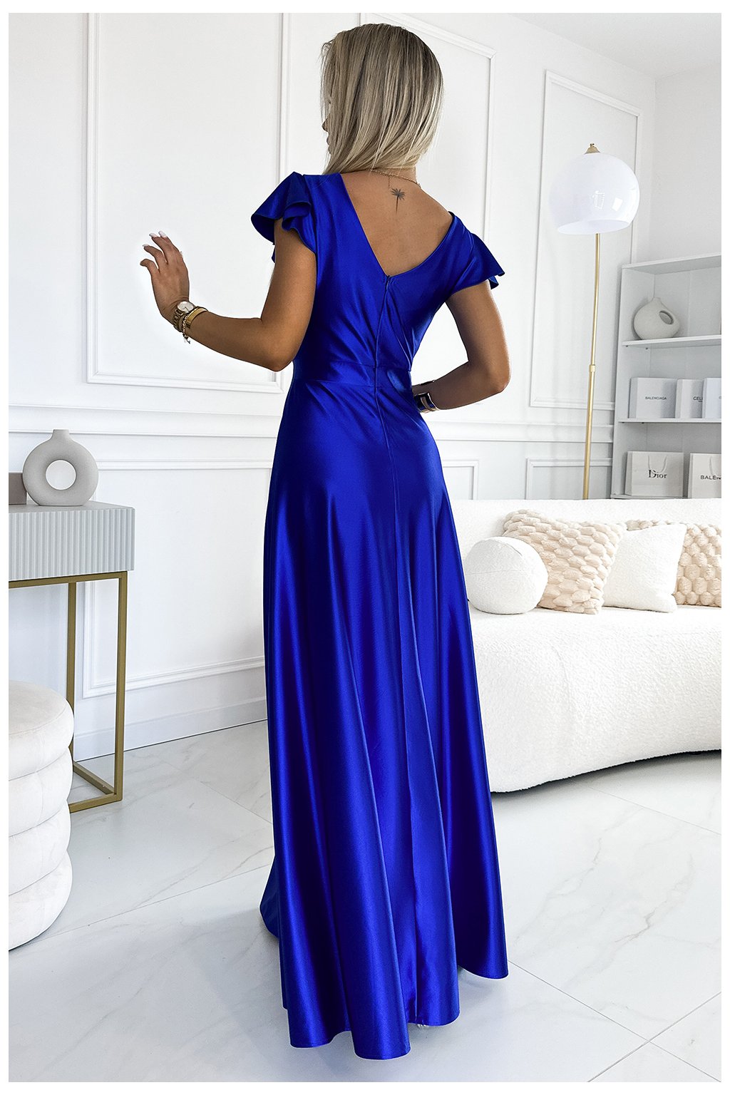 411-11 CRYSTAL saténové dlouhé šaty s výstřihem - modrý