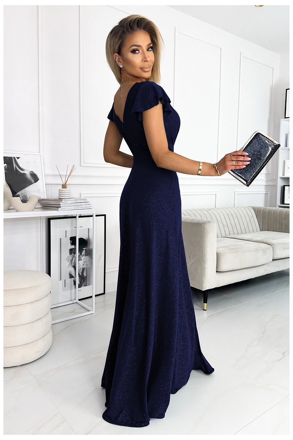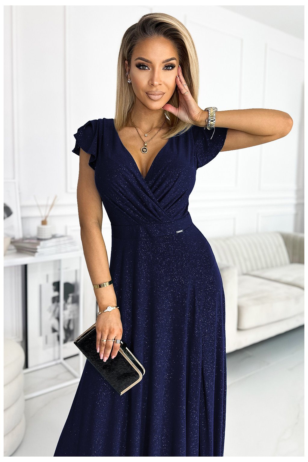 CRYSTAL dlouhé lesklé maxi šaty s psaníčkovým výstřihem a rozparkem na nohavici. Barva: tmavě modrá se třpytkami. Šaty krásně odhalují dekolt a jsou skvělé pro tanec. Zapínání zpět na zip. Polský výrobek. Značka Numoco.