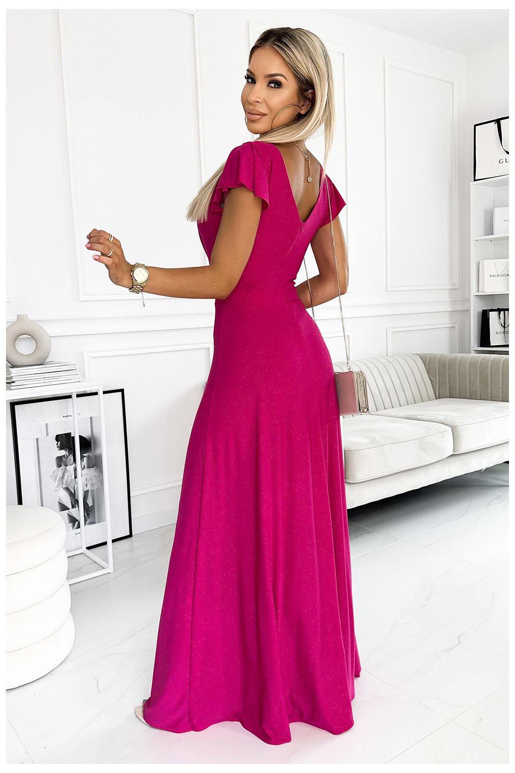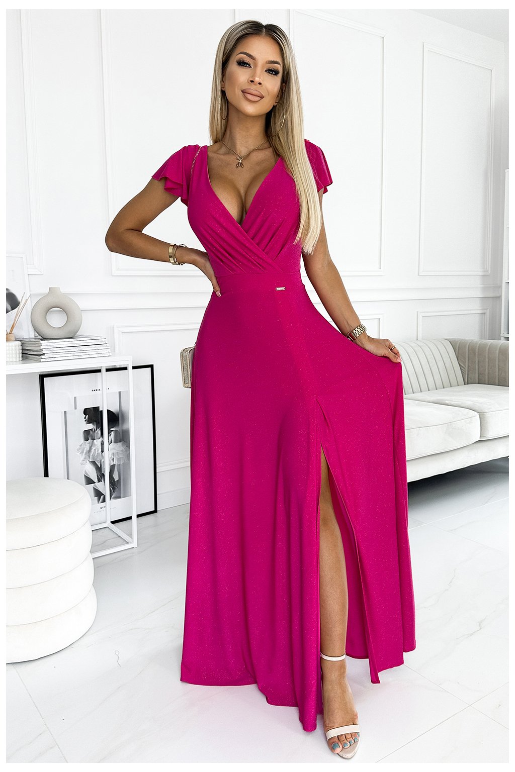 CRYSTAL dlouhé lesklé maxi šaty s psaníčkovým výstřihem a rozparkem na nohavici. Barva: Fuchsiová se třpytkami. Šaty krásně odhalují dekolt a jsou skvělé pro tanec. Zapínání zpět na zip. Polský výrobek. Značka Numoco.
