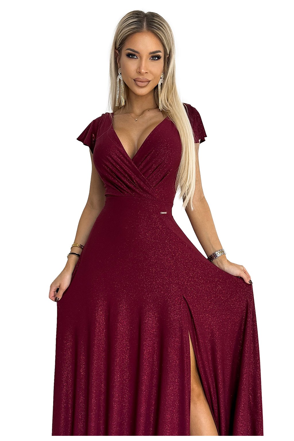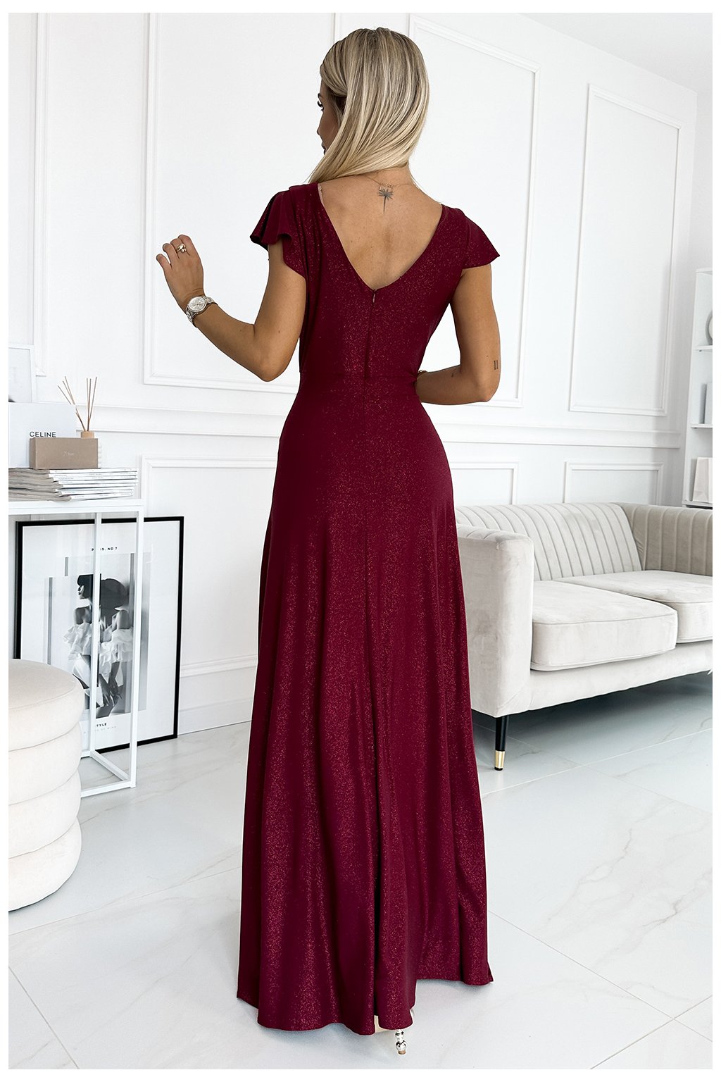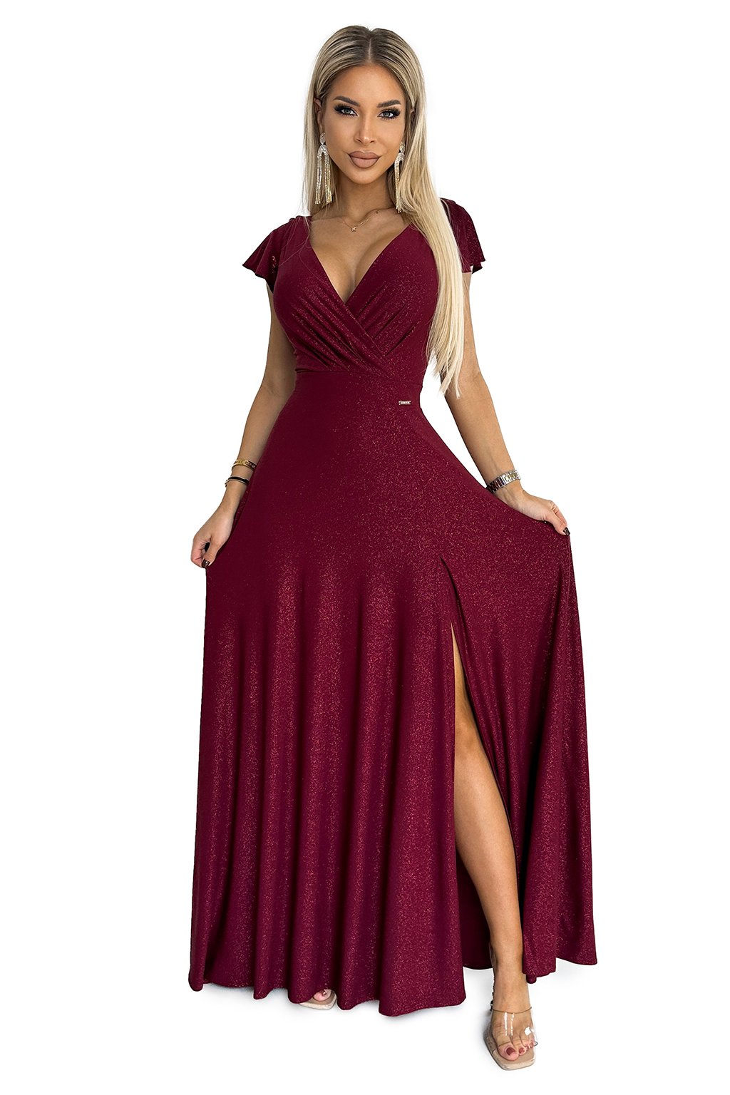 CRYSTAL dlouhé lesklé maxi šaty s psaníčkovým výstřihem a rozparkem na nohavici. Barva: vínová se třpytkami. Šaty krásně odhalují dekolt a jsou skvělé pro tanec. Zapínání zpět na zip. Polský výrobek. Značka Numoco.