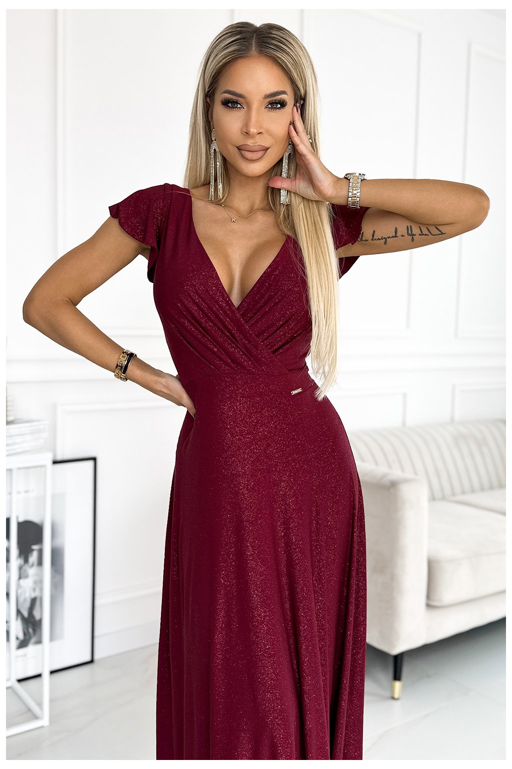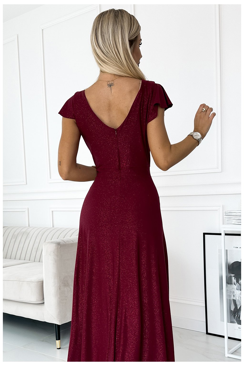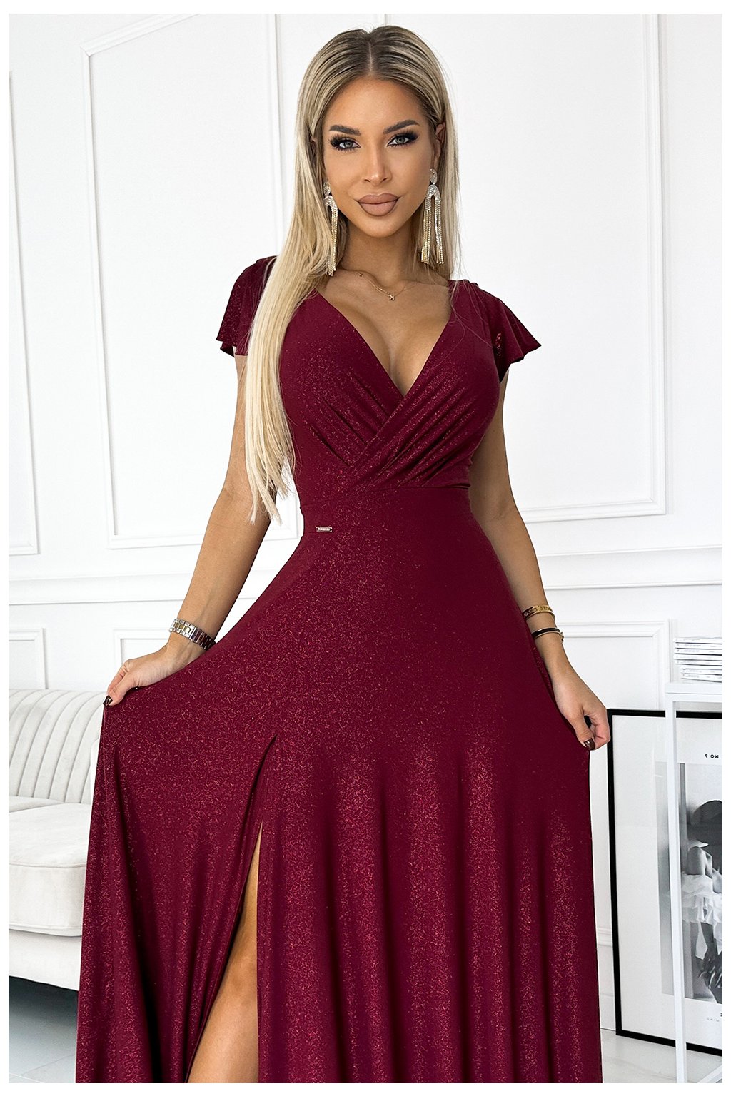CRYSTAL dlouhé lesklé maxi šaty s psaníčkovým výstřihem a rozparkem na nohavici. Barva: vínová se třpytkami. Šaty krásně odhalují dekolt a jsou skvělé pro tanec. Zapínání zpět na zip. Polský výrobek. Značka Numoco.