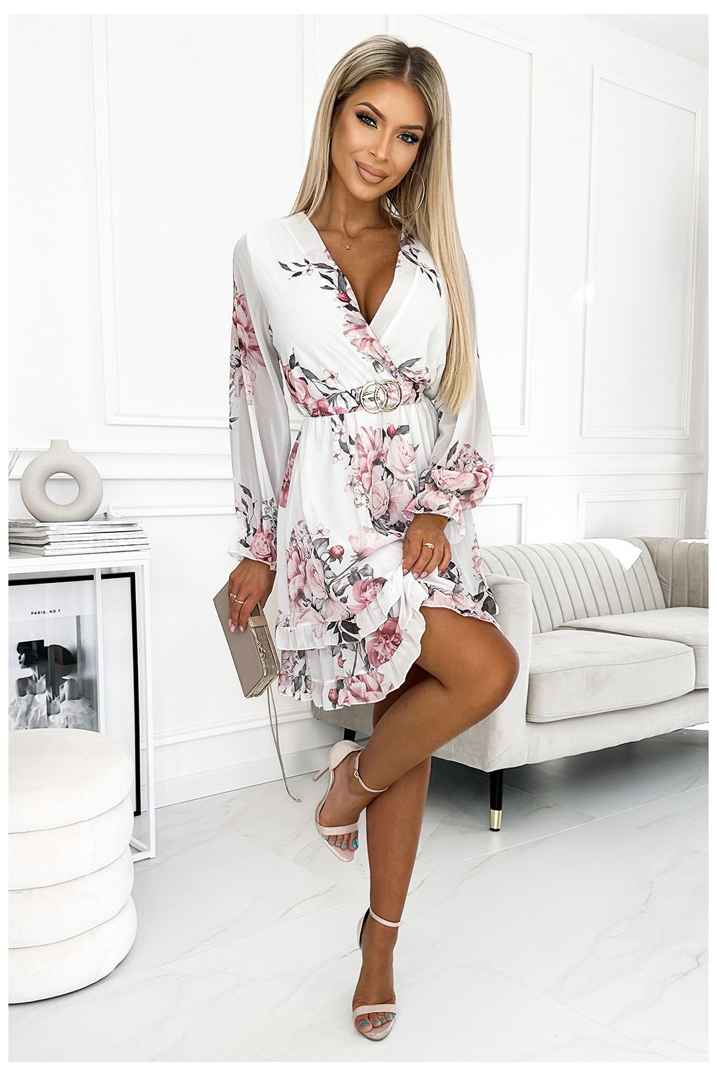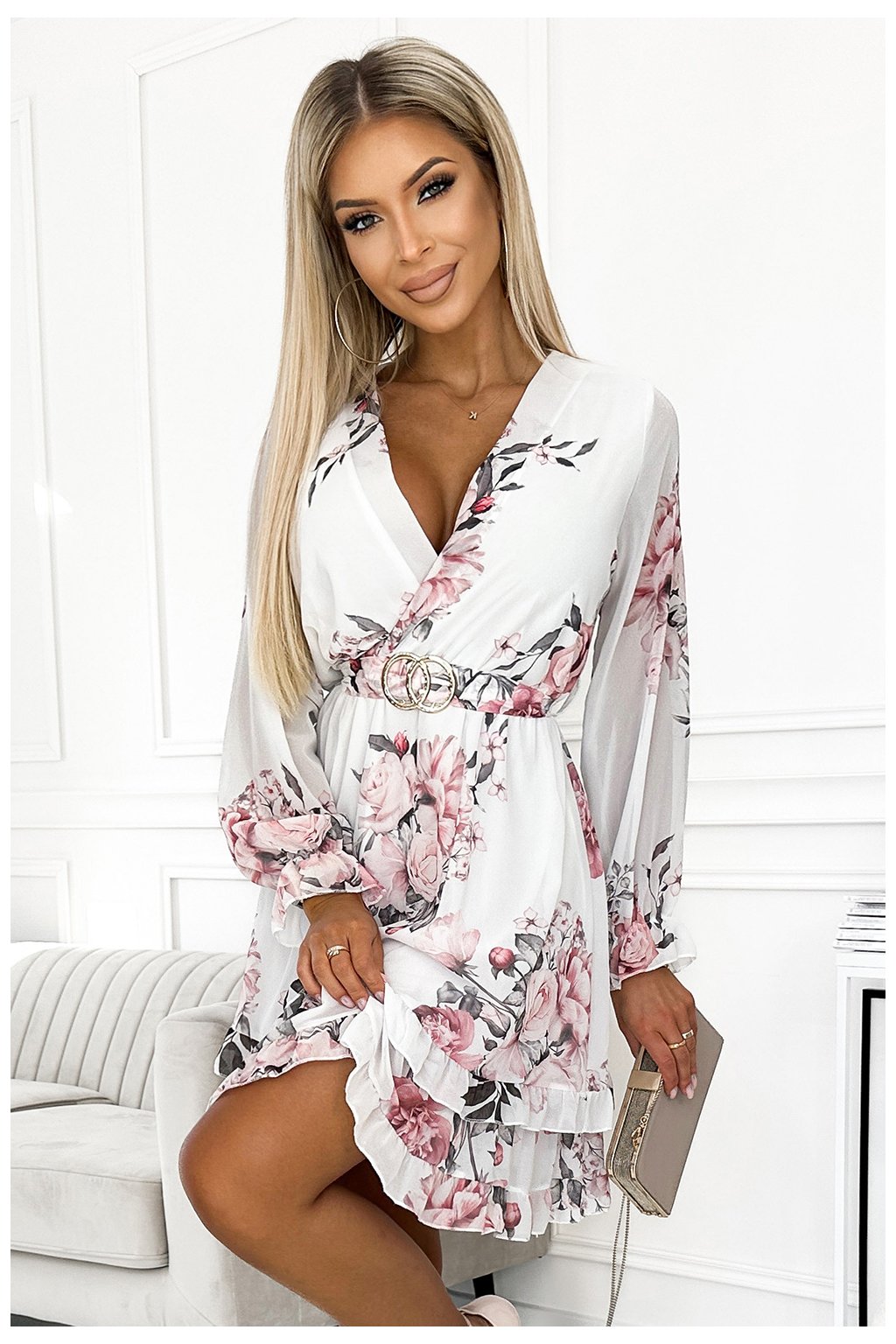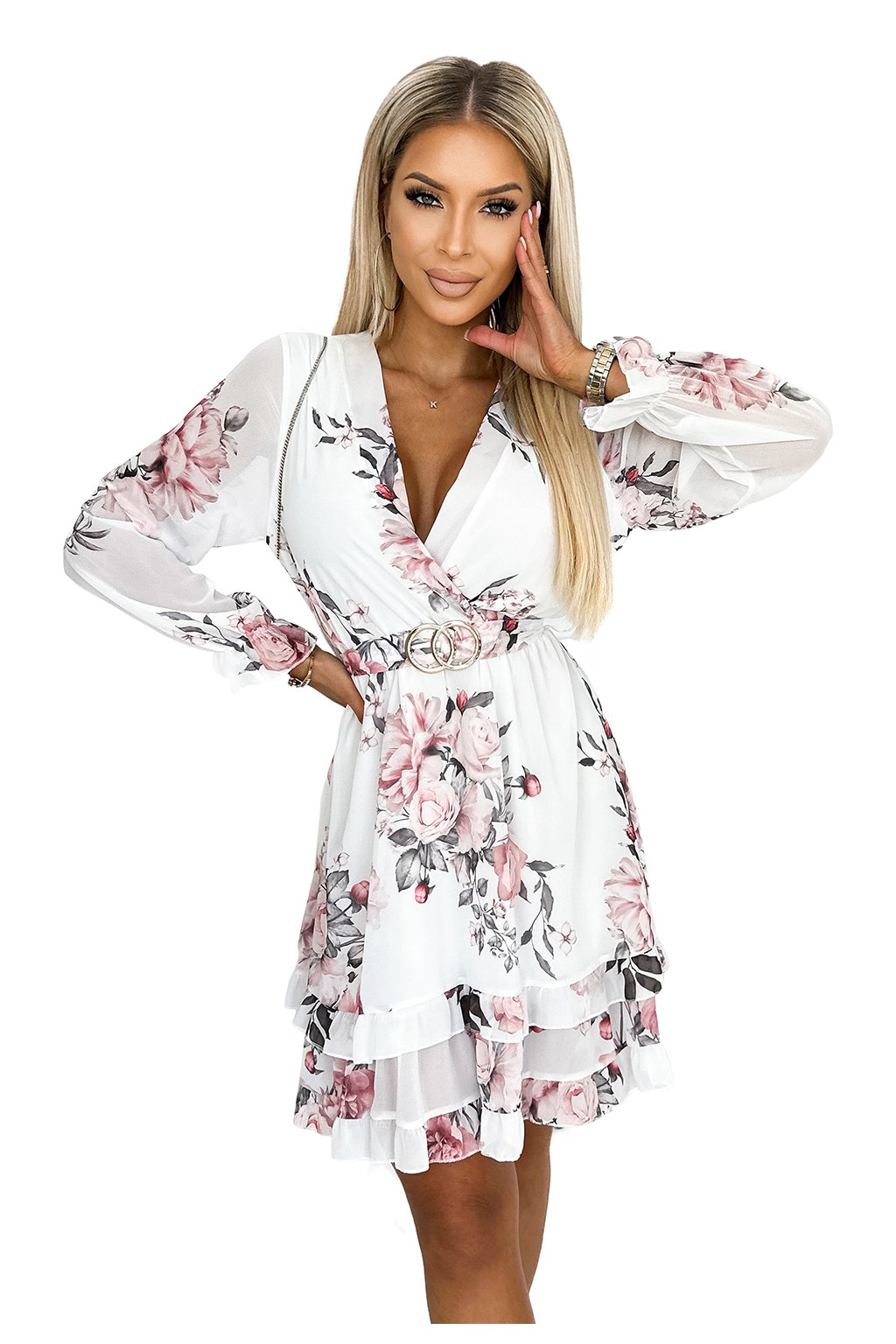 Rosetta - ženské šaty s volánky, dvojitá sukně, psaníčkový výstřih a pásek. Vyrobeno ze šifonového materiálu s podšívkou. Bezešvé vzor s růžemi na bílém pozadí. Značka Numoco. evropská produkce.