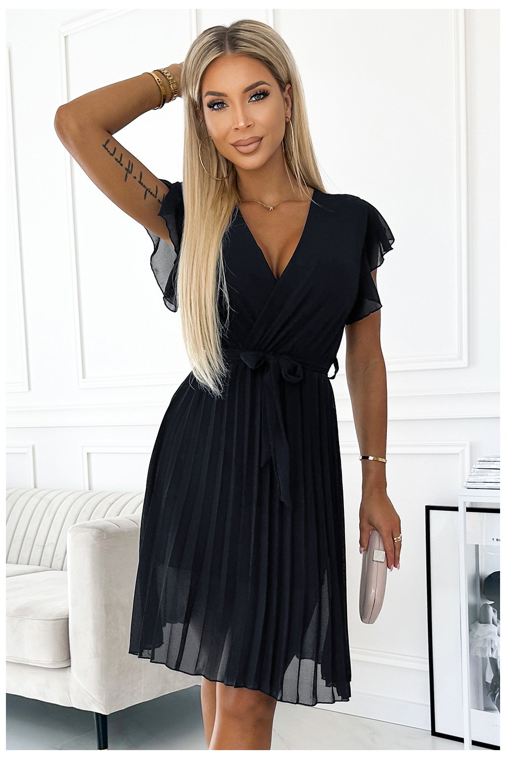 424-4 Šifonové řasené šaty s výstřihem a volány - Černá