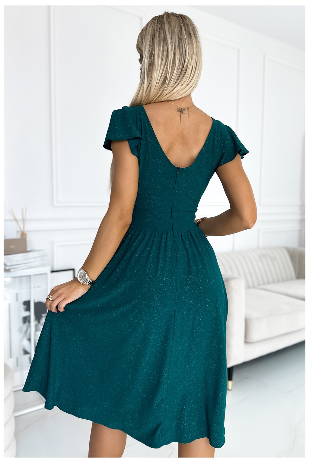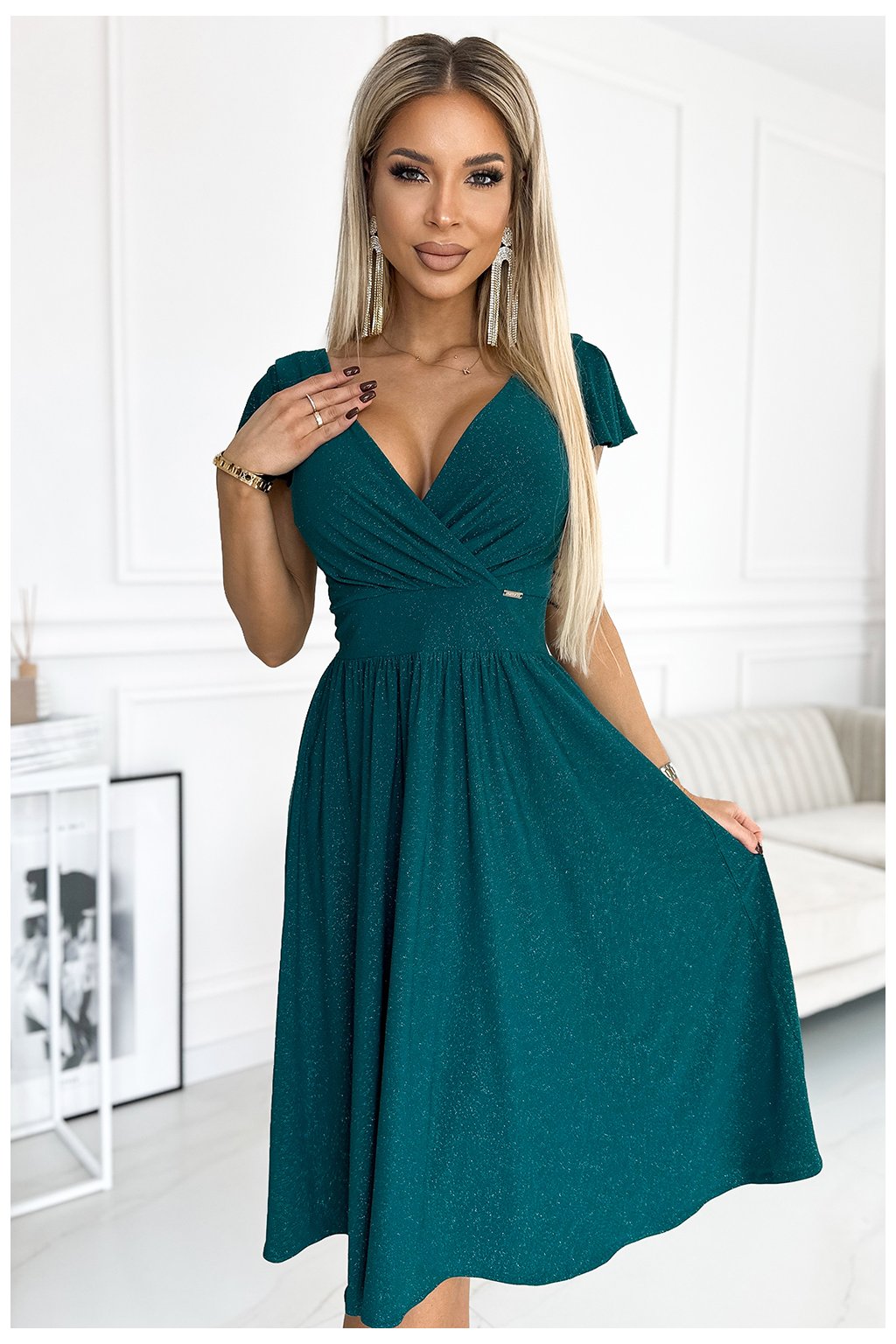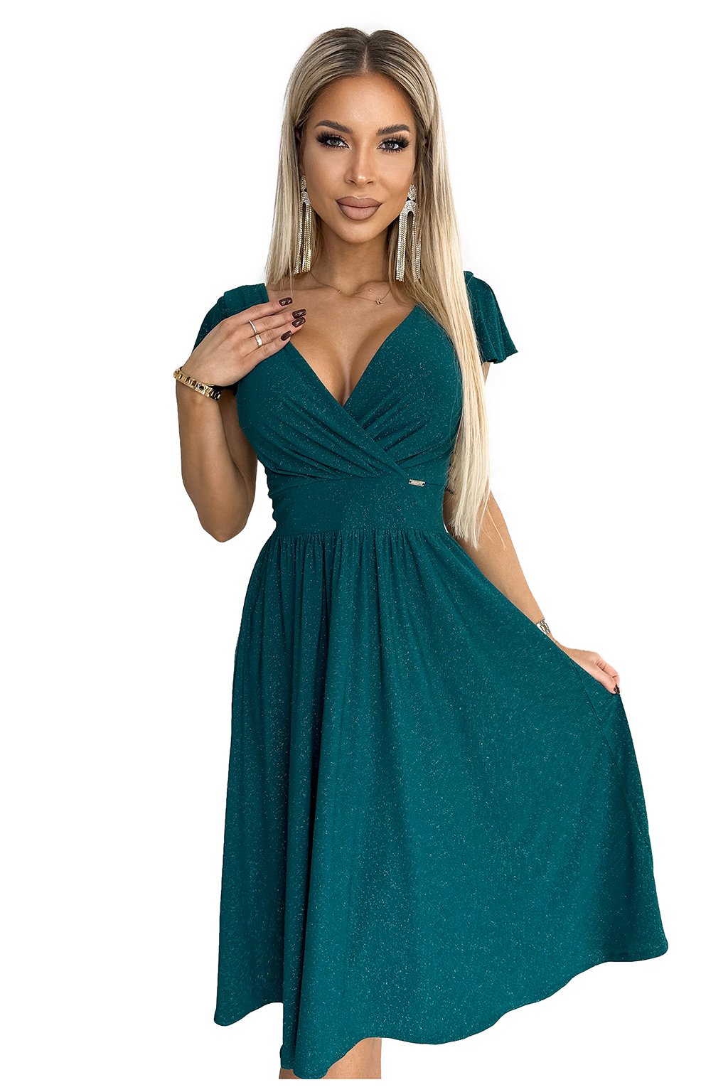 425-6 MATILDE Šaty s výstřihem a krátkým rukávem - zelená se třpytkami