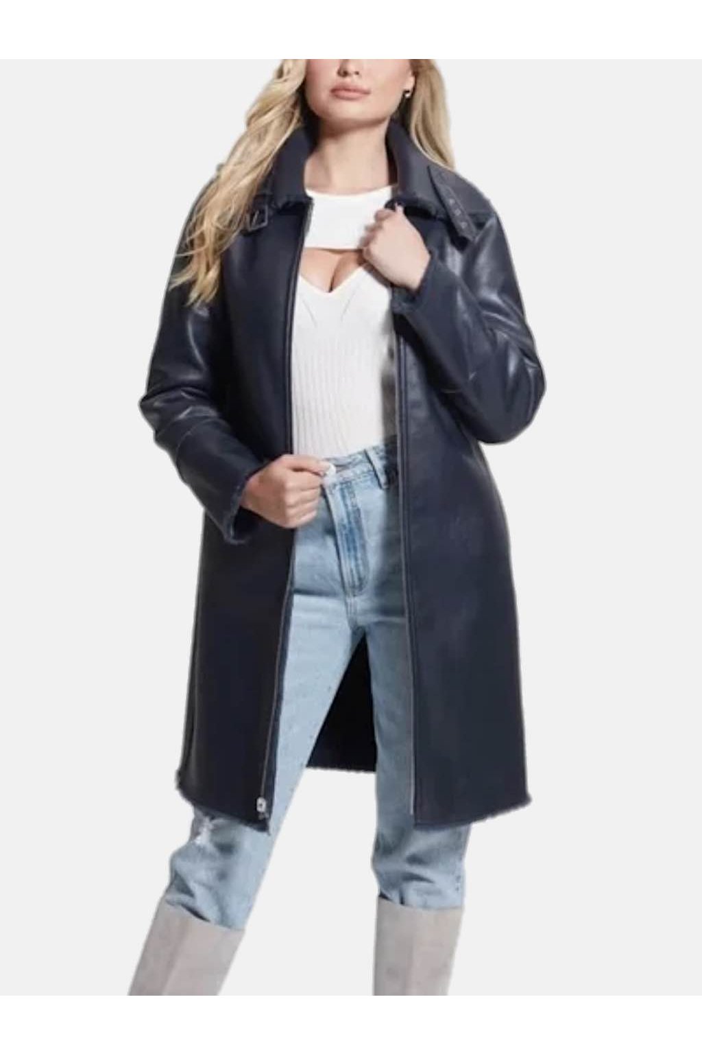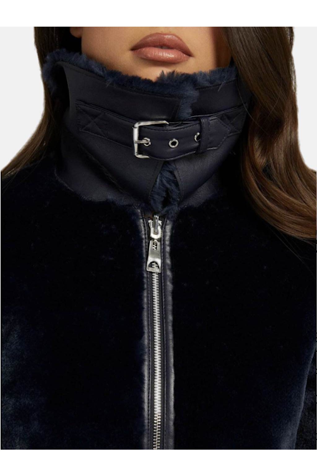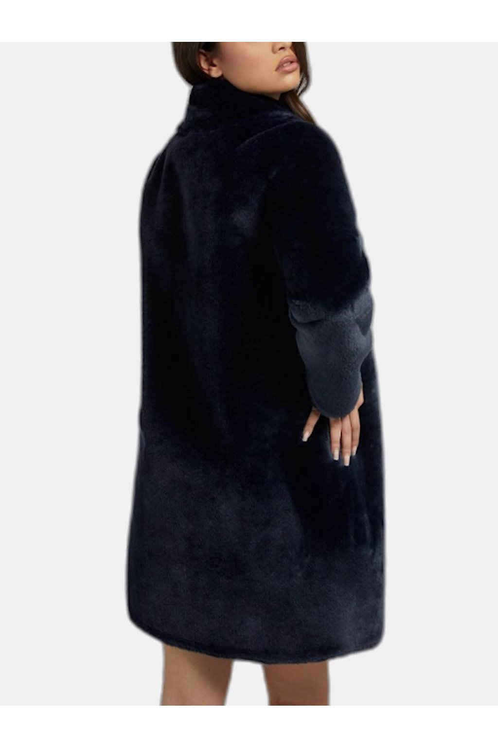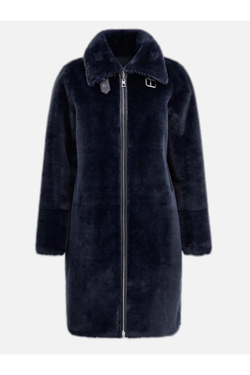 Tmavomodrý oboustranný dámský kožešinový kabát z kolekce Guess.